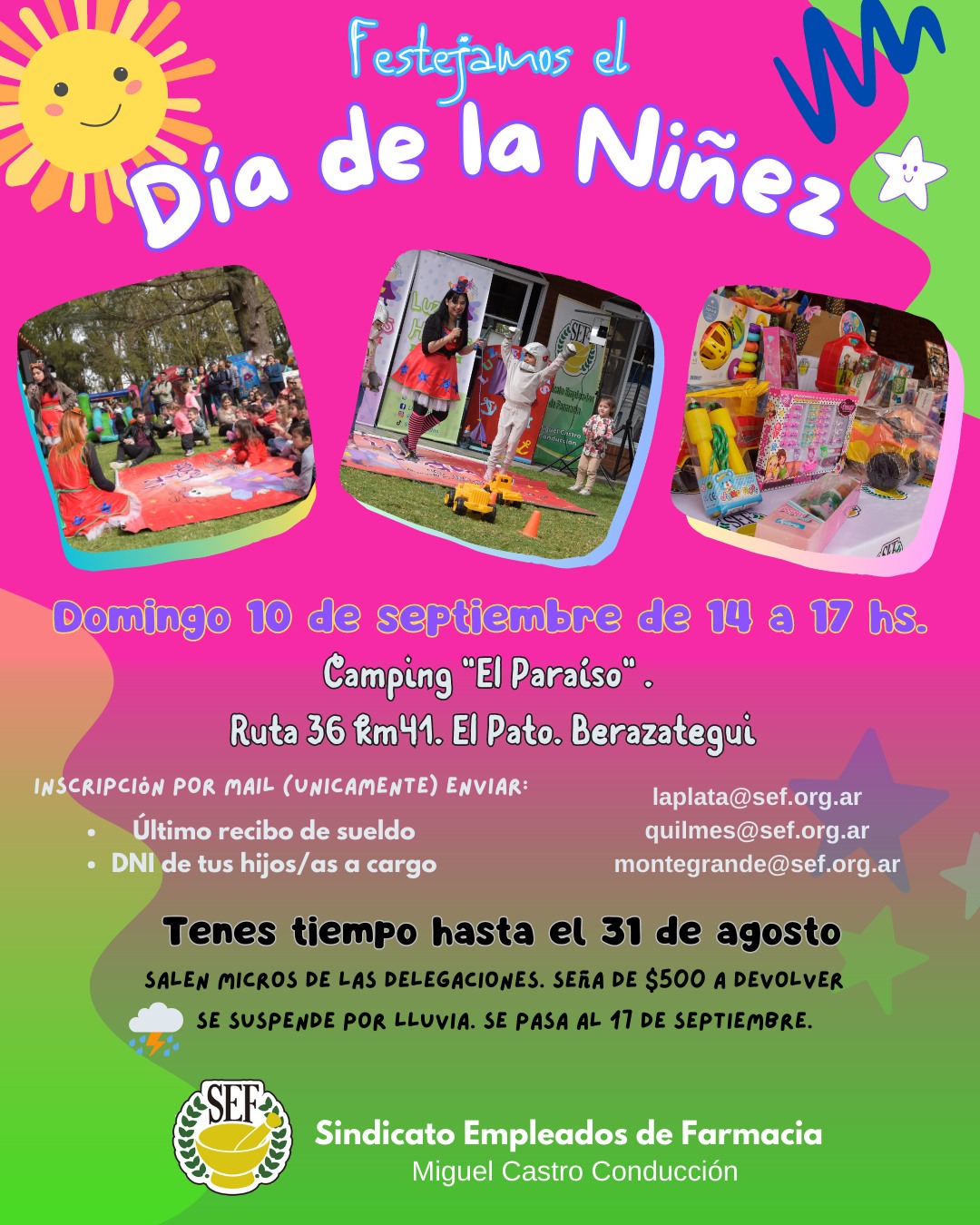 Invitamos a la familia del SEF a festejar el Día de la Niñez el domingo 10 de septiembre de 14 a 17 hs. en el Camping "El Paraíso" . El Parque del camping se prepara para pasar una tarde a pura diversión con la animación de "Luz de Hadas", juegos inflables, maquillaje artístico, espacio de arte para que los chicos pinten y diversas propuestas para grandes y chicos. No faltará la merienda con panchos, bebidas y mesa de dulces.